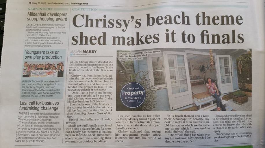 cambridge news article Posted by chrissyjbrown on April 30, 2016 Share this: Email a link to a friend (Opens in new window) Email Print (Opens in new window) Print Share on Facebook (Opens in new window) Facebook Share on LinkedIn (Opens in new window) LinkedIn Share on Reddit (Opens in new window) Reddit Share on X (Opens in new window) X Share on Tumblr (Opens in new window) Tumblr Share on Pinterest (Opens in new window) Pinterest Like Loading... This is an image for Everybody loves a She Shed…. Images navigation Next →